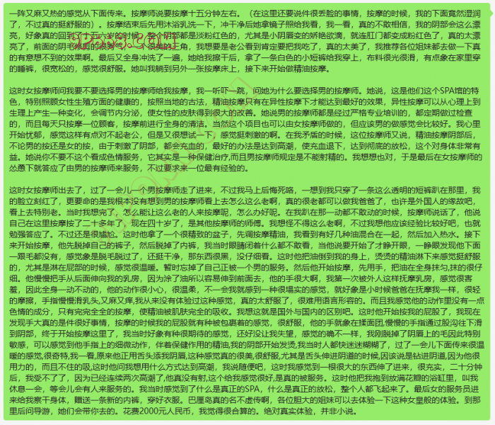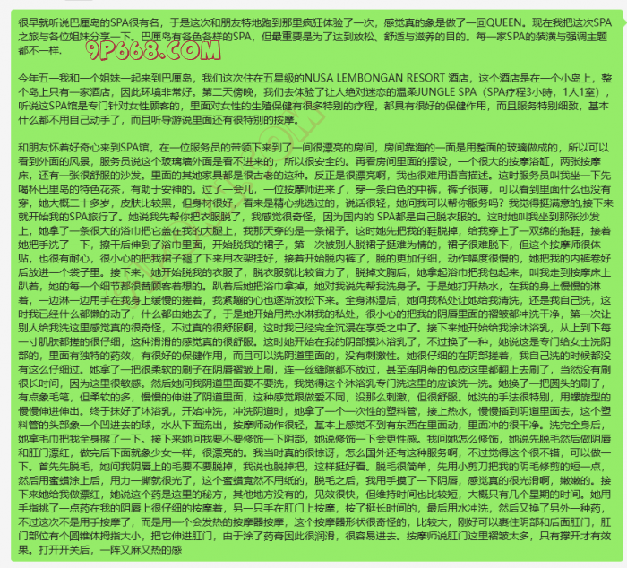 最后女的服务员进来给我察干身体,赠送一条新的内裤,穿好衣服。巴厘岛真的名不虚传啊,各位胆大的姐妹可以去体验一下这种女皇般的体验。到那里后问导游,她们会带你去的。花费2000元人民币,我觉得很合算的。